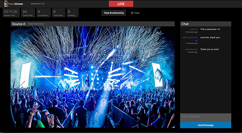 The platform supports standard definition through 4K quality with ultra-low latency (around one second). Organizers can broadcast using a simple webcam from the dashboard or connect professional equipment via RTMP integration with software like OBS. The stream includes integrated live chat for audience interaction.